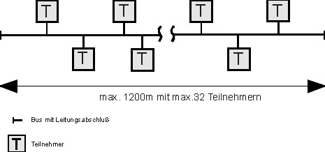 | Die Abbildung zeigt die sich aus den physikalischen Einschränkungen der RS-485 Norm ergebende einfache Netztopologie. | |